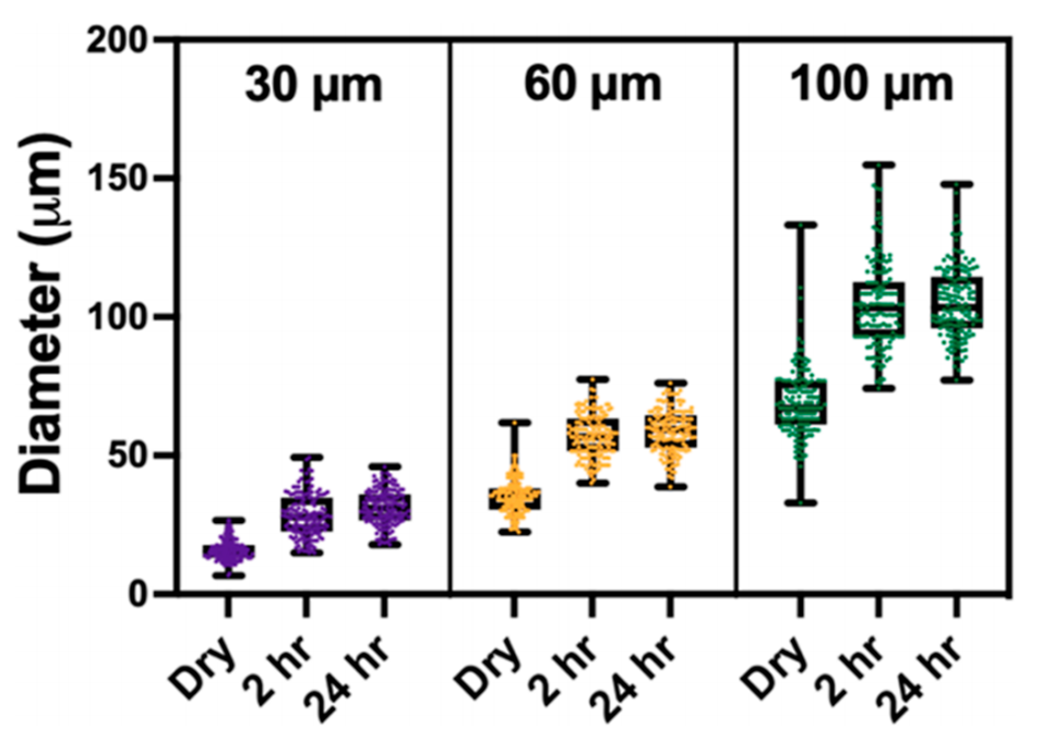 图5.SC-HMPs的溶胀行为:冻干后的微粒在37°C的1× PBS中孵育2小时和24小时后,小粒径微粒(33.7 μm)溶胀率可达77.0%,且所有微粒溶胀后形态恢复率超过90%。