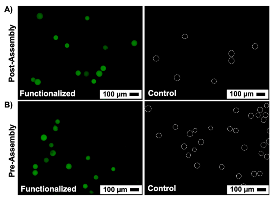 4、交联剂中的炔基支持硫醇-炔点击反应,可实现微粒的预组装或后组装功能化(如荧光标记),拓展了其在药物递送和组织工程中的功能性应用。
