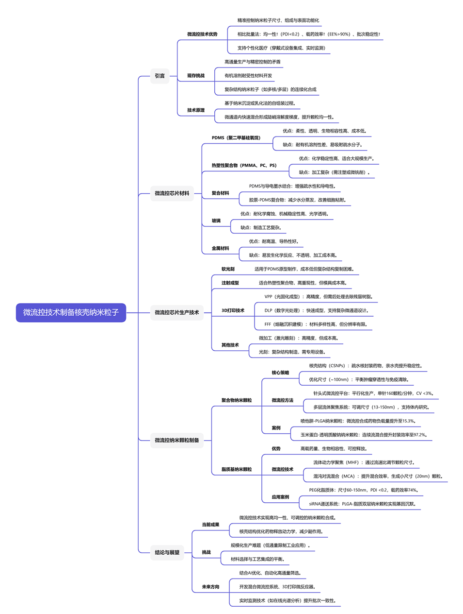 5、展示了微流控制备的核壳纳米粒子在癌症治疗(如紫杉醇载体)、基因递送(siRNA封装)及炎症性疾病治疗中的实际应用案例,验证其临床转化潜力。