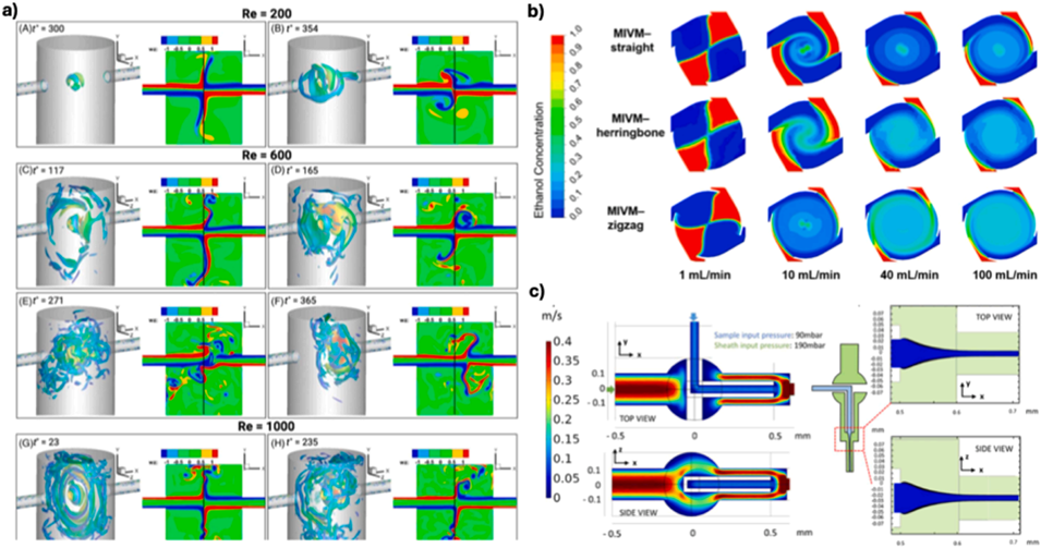 图1.a)展示了受限冲击射流混合器(CIJM)中混沌流态下涡旋动力学的时间演化过程,通过三维与二维平面视图呈现不同阶段(A-B、C-F、G-H)的涡流特征;b)三种多入口涡旋混合器(MIVM)在固定流速比(FRR)下,不同总流速比(TFR)对应的混合腔内乙醇质量分数等值线图;c)微流道在xy和zx平面内的流速分布图,显示鞘流入口压力分别为90 mbar和190 mbar时,“T”形通道通过球形扩张结构实现下游流速均匀化,克服通道障碍效应。