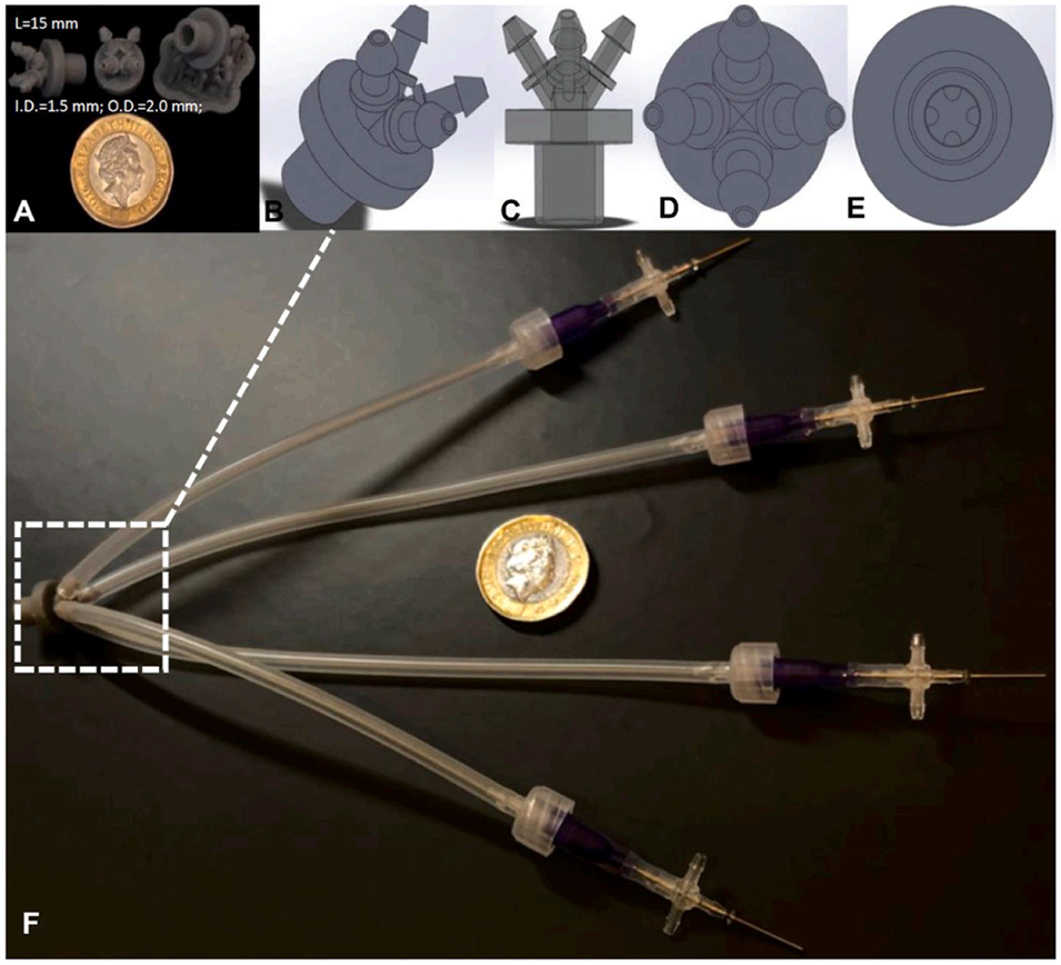 图2.(A)3D打印四通连接器(FWC)实物图;(B)立体视图;(C)横截面视图;(D)俯视图;(E)底视图;(F)基于FWC的并行针头装置示意图,用于生成PDMS单乳液微滴,体现模块化设计对高通量生产的优化。