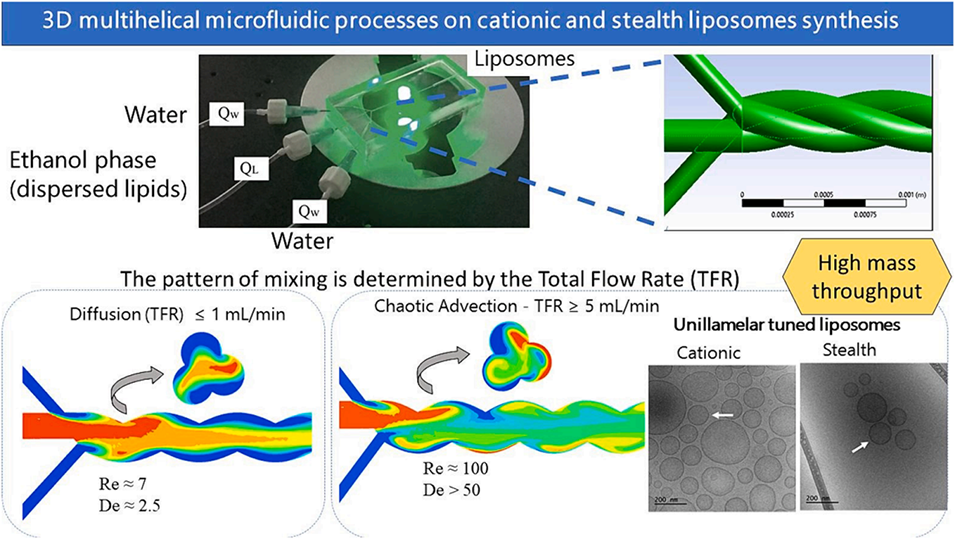 图8.3D多螺旋微流控装置作用机制:高总流速(TFR≥5 mL/min)下,Dean流诱导混沌对流增强混合效率,促进脂质体高效自组装;低流速(TFR≤1 mL/min)时扩散主导,效率降低。电镜图像验证单层脂质体结构的精确控制。