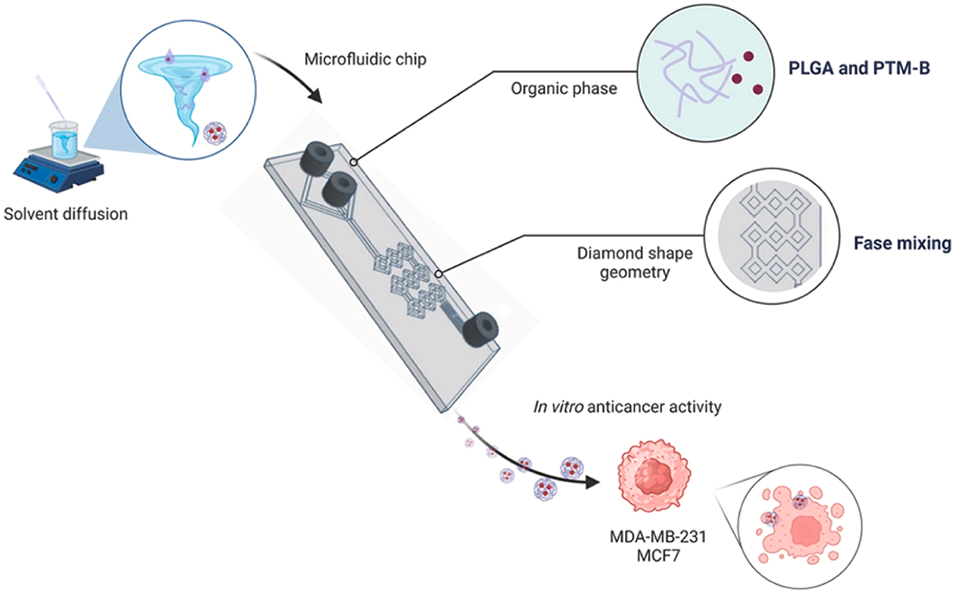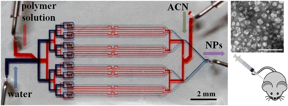 图4.基于3D流体动力学聚焦(HFF)的多层微流控系统示意图:通过并行化通道设计合成PLGA-PEG纳米粒子,实现20 nm级超小粒径的可控制备,支持体内药代动力学与肿瘤靶向研究。