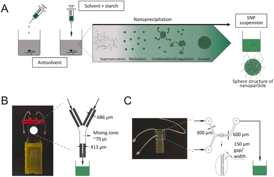 图5.淀粉纳米沉淀反应器设计对比:(A)传统批量法的逐滴混合与直接混合模式;(B)Y型受限冲击射流混合器(CIJM);(C)Y型交错人字形混合器(SHM),证明微流控快速混合(毫秒级)可精准调控纳米粒子尺寸(~100 nm)并降低多分散性(PDI 0.079)。