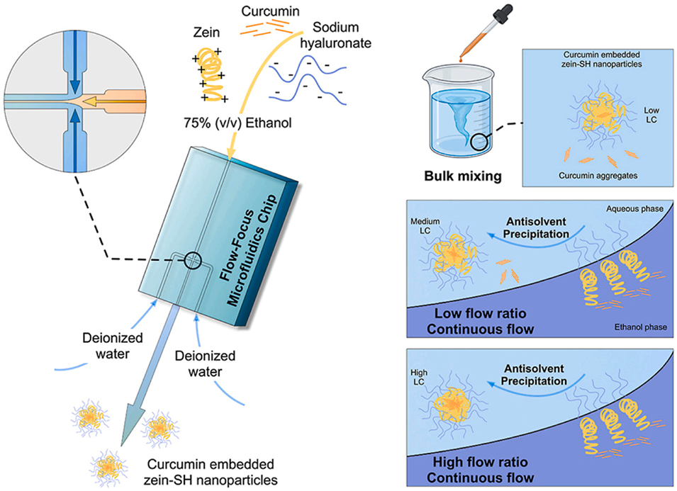 图6.姜黄素负载玉米醇溶蛋白-巯基透明质酸(Zein-SH)纳米粒子的抗溶剂沉淀制备流程:对比批量混合(载药量0.4%)与连续流动法(流速比8-24),微流控毫秒级混合(13.23-102.06 ms)使粒径从319 nm降至80 nm,载药量提升至11.1%,且二级结构更有序。