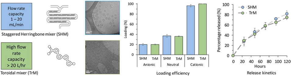 图7.层流微流控反应器性能表征:(A)交错人字形与环形混合器设计;(B)脂质体载药效率(26-36%)与释放动力学(24小时释放20-30%,120小时达70-85%),满足粒径(60±10 nm)、多分散性(PDI<0.2)等GMP生产标准。