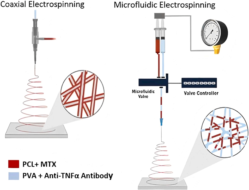图10.通过微流体辅助静电纺丝封装甲氨蝶呤和抗TNFα抗体的过程示意图,作为同轴纺丝的替代方法,用于局部治疗炎症性关节疾病。
