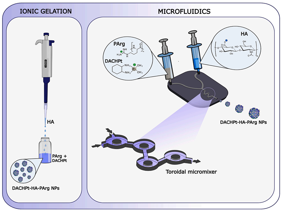 图1.传统离子凝胶化方法和微流控技术制备负载DACHPt的NPs。
