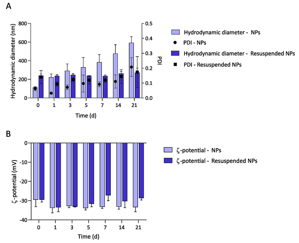 图2.冻干和再悬浮前后DACHPt-HA-PArg NPs的稳定性研究:(A)流体动力学直径(nm)和PDI,以及(B)ζ电位。