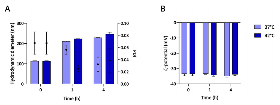 图3.DACHPt-HA-PArg NPs的热稳定性研究。(A)DACHPt-HA-PArg NPs在37℃和42℃孵育1h和4h时的尺寸(z-average)和PDI,(B)ζ电位。