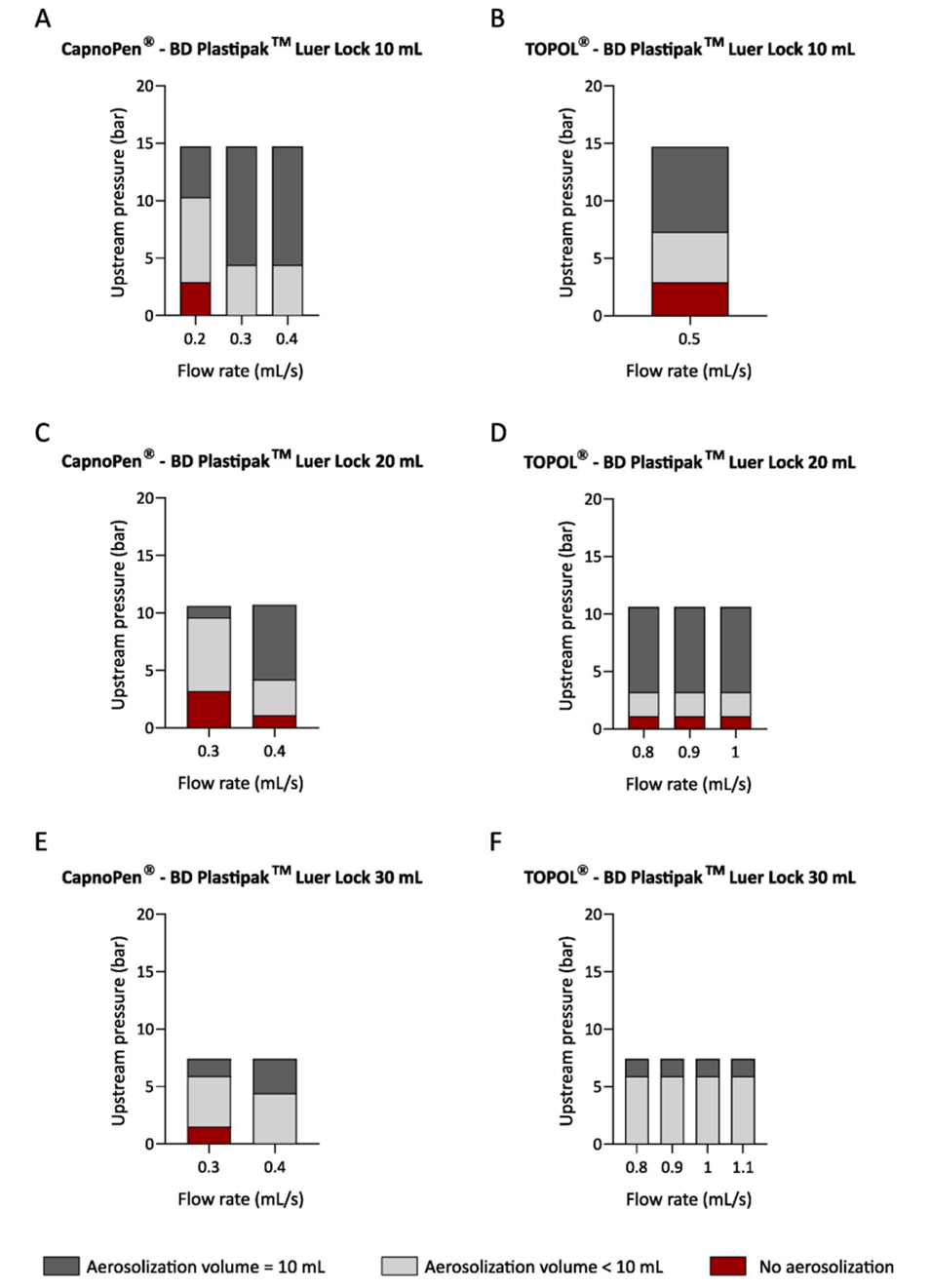 3、在临床前模型中,使用CapnoPen®和TOPOL®两种雾化设备,结合注射泵实现了临床最佳雾滴尺寸范围(25-50微米),CapnoPen®在14.7 bar压力和0.4 mL/s流速下产生38微米的雾滴,而TOPOL®在7.4 bar压力和1.1 mL/s流速下产生64微米的雾滴。