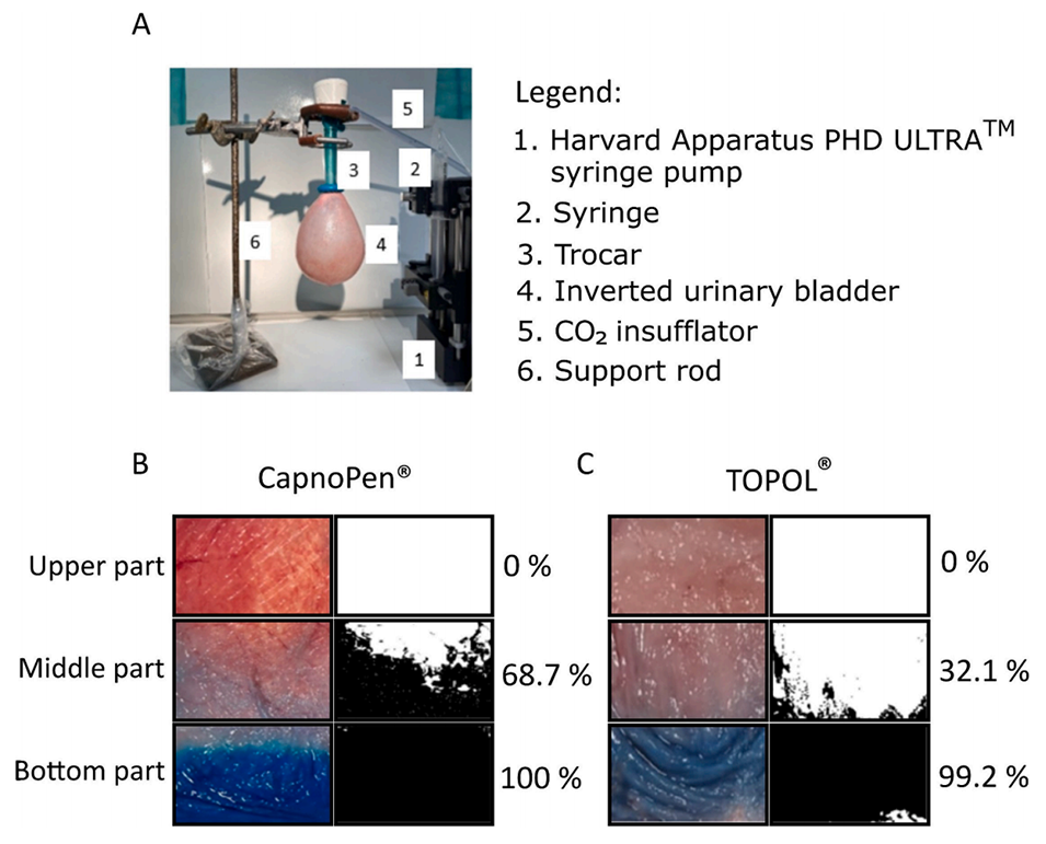 图6.仿生腔内气溶胶分布。(A)CO2充气管、雾化装置及倒置猪膀胱的实验设置示意图。(B)使用CapnoPen®和(C)TOPOL®气雾剂装置在膀胱上段、中段和下段获得的染色溶液分布百分比。