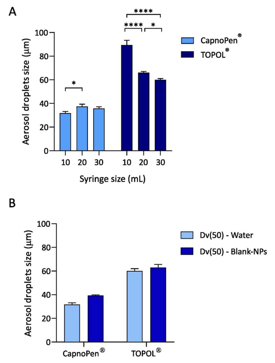 图5.气溶胶液滴尺寸。(A)使用各喷雾装置与注射器组合在最高流速和上游压力(确保完全雾化)下获得的气溶胶液滴尺寸。(B)在优化参数下,空白纳米颗粒(NPs)与纯水的气溶胶液滴尺寸对比。统计分析采用双向方差分析(ANOVA)进行多重比较:*p<0.05,**p<0.01,***p<0.001,****p<0.0001。