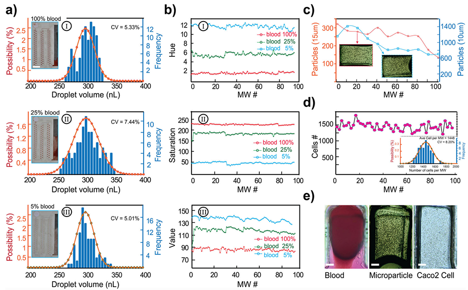 经实验验证,血液样本(黏度≈4 mPa·s)与低黏度唾液(≈1 mPa·s)均生成300 nL液滴,体积变异系数分别为5.33%和5.01%。此外,微孔内细胞分布均匀(CV=8.2%),支持精准单细胞分析。