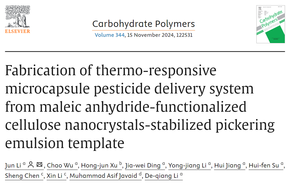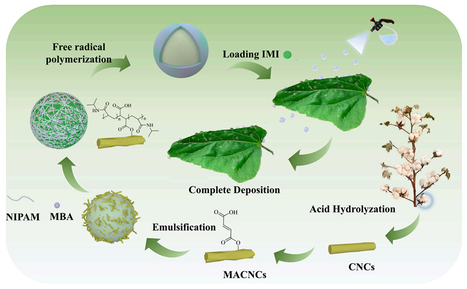 近期,新疆农业大学化学化工学院李君副教授团队利用马来酸酐功能化纤维素纳米晶体(MACNCs)稳定的Pickering乳液作为模板,通过自由基聚合接枝N-异丙基丙烯酰胺(NIPAM),制备了具有温度响应性的微胶囊(MACNCs-g-NIPAM)。将吡虫啉(IMI)负载到这种微胶囊中,形成了智能释放系统(IMI@MACNCs-g-NIPAM)。相关研究以“Fabrication of thermo-responsive microcapsule pesticide delivery system from maleic anhydride-functionalized cellulose nanocrystals-stabilized pickering emulsion template”为题,发表于期刊《Carbohydrate Polymers》。