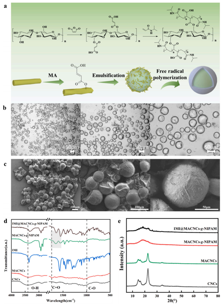 图2.MACNCs-g-NIPAM的物理化学性质:(a)机理图;(b)MACNCs-g-NIPAM的光学显微镜图像和(c)SEM图像;(d)傅里叶变换红外光谱;(e)XRD图谱。