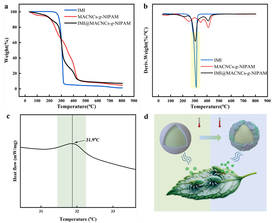 图3.MACNCs-g-NIPAM的热稳定性:(a)TG;(b)DTG;(c)DSC;(d)温度响应示意图。