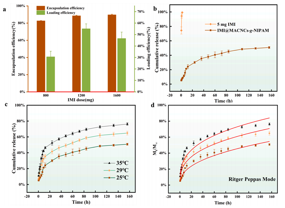 图4.(a)IMI@MACNCs-g-NIPAM的EE和LE;释放和动力学研究:(b)纯IMI释放和IMI@MACNCs-g-NIPAM中的IMI释放;(c)IMI@MACNCs-g-NIPAM在不同温度下的IMI释放;(d)IMI@MACNCs-g-NIPAM在不同温度下释放IMI的Ritger-Peppas动力学模型。