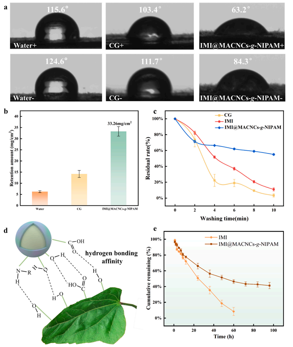 图5.IMI@MACNCs-g-NIPAM在棉花叶片表面的扩散性、滞留性和雨水冲刷残留率:(a)接触角(+和-表示棉花叶片的前后两侧);(b)IMI@MACNCs-g-NIPAM保留;(c)IMI@MACNCs-g-NIPAM的抗雨蚀性;(d)微胶囊和叶子之间的氢键结合力;(e)不同农药的累积残留。