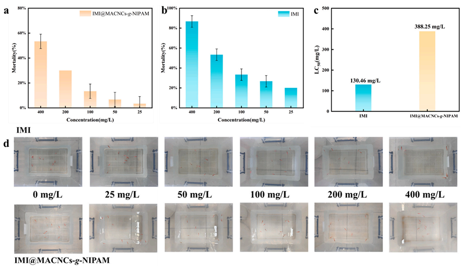 图7.斑马鱼死亡率:(a)IMI@MACNCs-g-NIPAM;(b)CG;(c)CG和IMI@MACNCs-g-NIPAM的LC50;(d)施用不同浓度的IMI@MACNCs-g-NIPAM后斑马鱼死亡的照片。