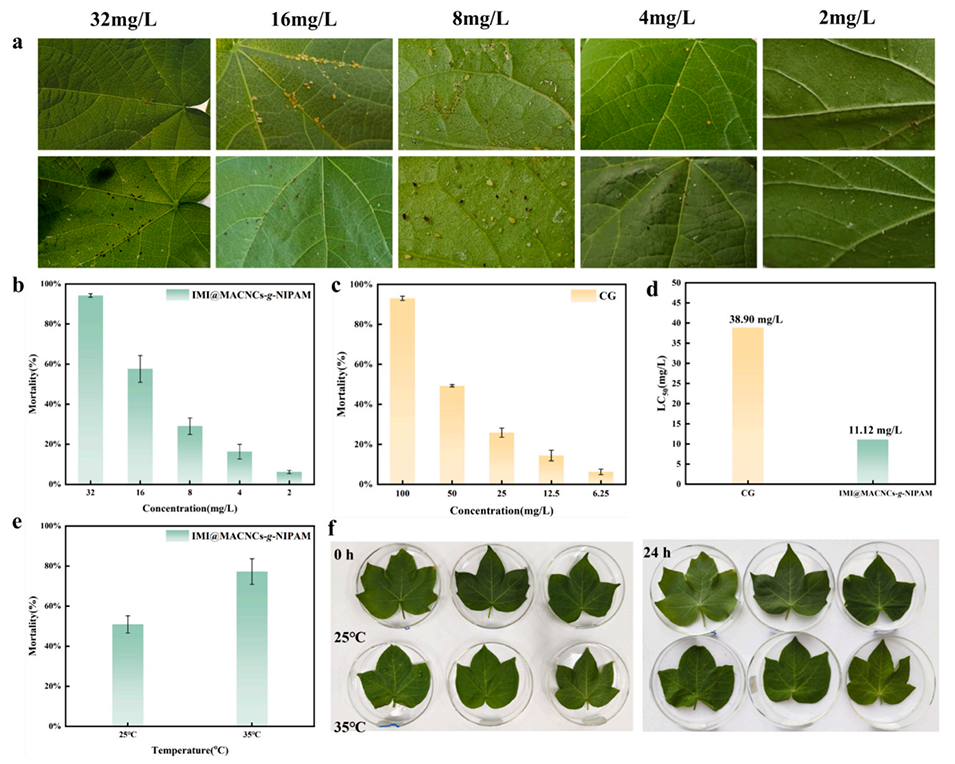 图6.(a)施用不同浓度的IMI@MACNCs-g-NIPAM后棉蚜死亡的照片;棉蚜死亡率:(b)IMI@-MACNCs-g-NIPAM;(c)CG;(d)CG和IMI@MACNCs-g-NIPAM的LC50;(e)不同温度下棉蚜的死亡率;(f)25°C和35°C下施用IMI@MACNCs-g-NIPAM后棉蚜死亡的照片。