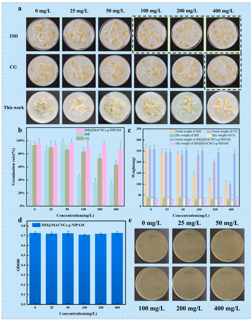 图8.不同IMI@MACNCs-g-NIPAM浓度(a)黄瓜幼苗照片;(b)黄瓜幼苗发芽率;(c)黄瓜幼苗干重和湿重;(d)大肠杆菌吸光度;(e)大肠杆菌生长的照片。