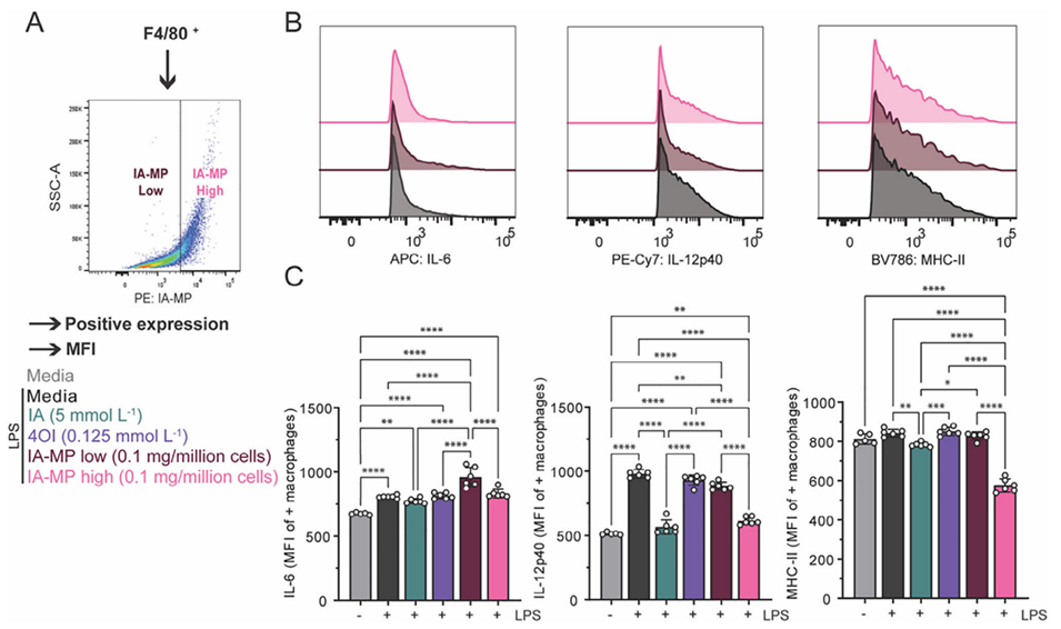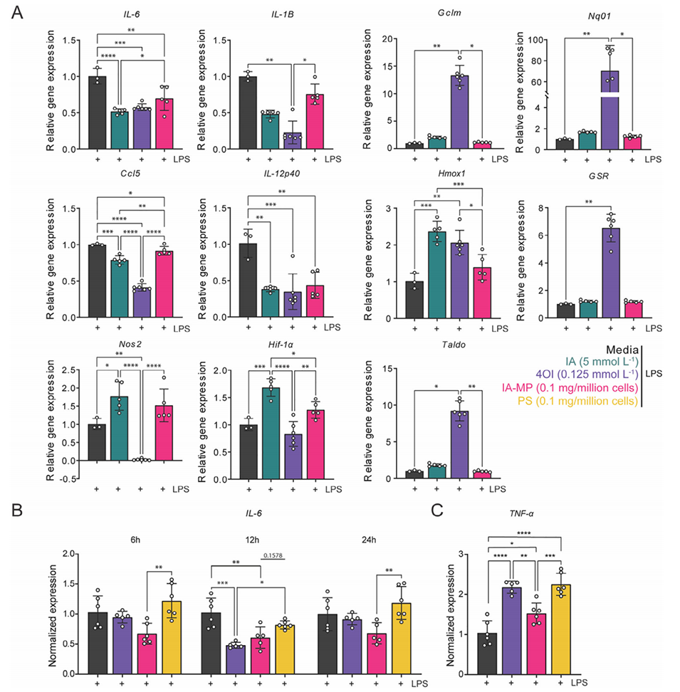 3、IA-MPs在巨噬细胞内降解释放IA,有效调节巨噬细胞功能,显著抑制了LPS刺激的BMDMs中关键促炎基因(IL-6, Ccl5, IL-12p40)和蛋白(IL-6)的表达,并降低抗原呈递分子(MHC-II)的表达,其效果与5 mmol/L浓度的游离IA处理相当。