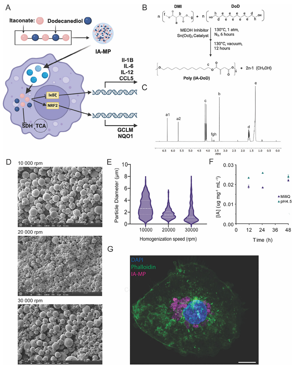 1、本研究开发了基于可降解聚十二烷基衣康酸酯(poly(IA-DoD))的衣康酸聚合物微粒(IA-MPs),通过乳液法可控制备出目标尺寸(≈1.5 μm)的微粒,旨在解决衣康酸(IA)因高极性和低生物利用度导致的细胞内递送难题。
