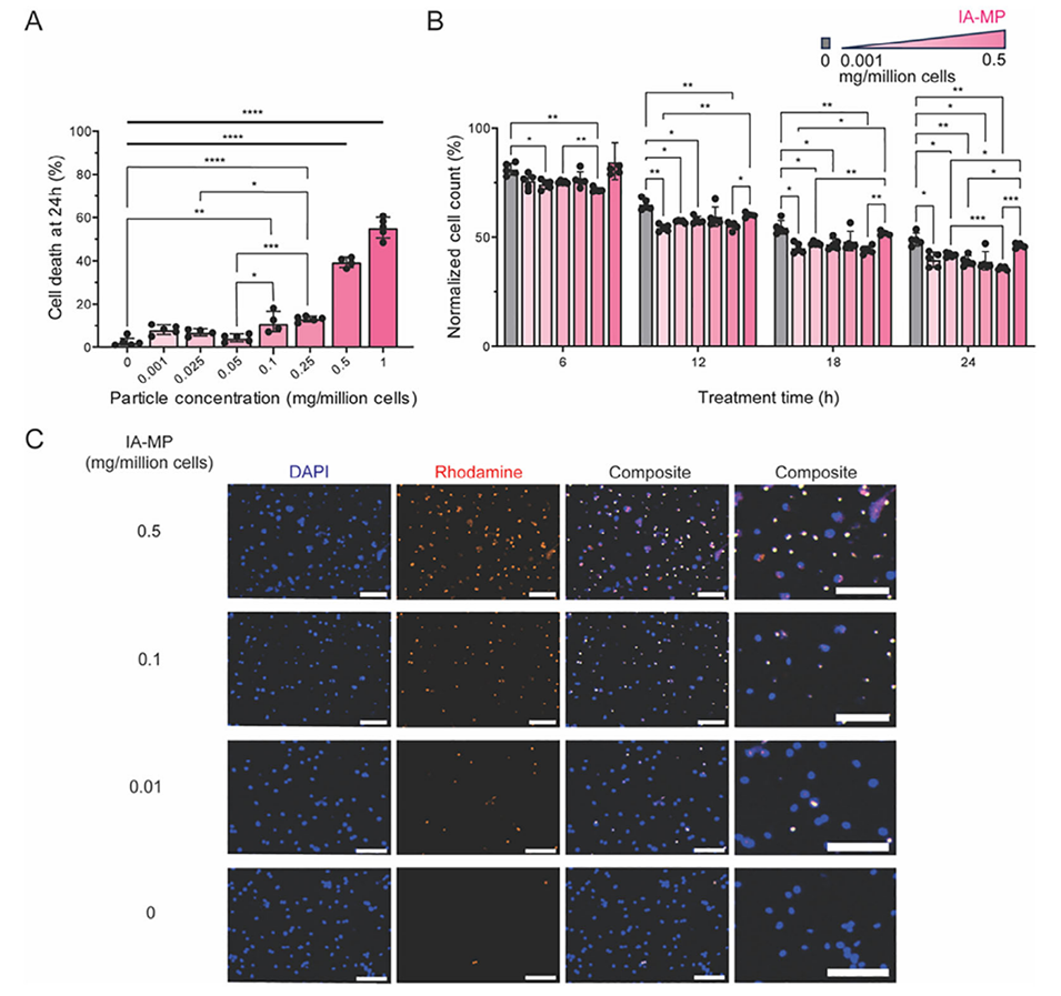 2、制备的IA-MPs能被脂多糖(LPS)激活的小鼠骨髓源性巨噬细胞(BMDMs)高效吞噬内化,在0.1 mg/百万细胞浓度下,99.96 ± 0.05%的细胞成功摄取微粒,且该浓度下细胞毒性保持较低水平。