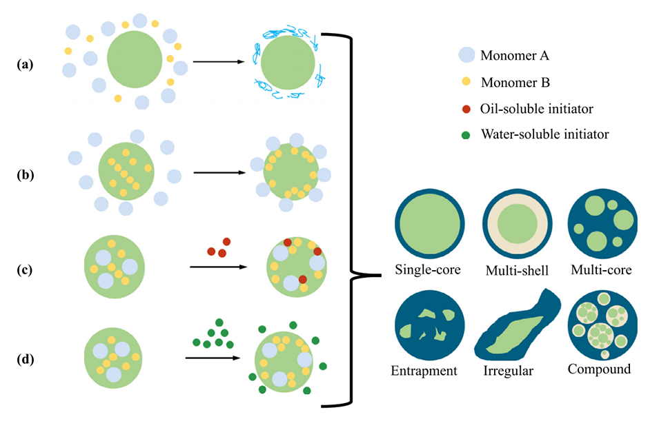 图2.制备微胶囊的常用化学方法以及微胶囊的典型结构和形态。(a)原位聚合,(b)界面聚合,(c)悬浮聚合,(d)乳液聚合。