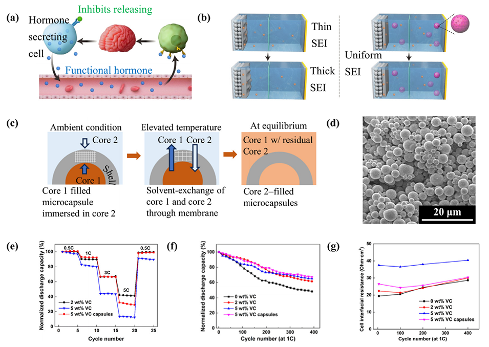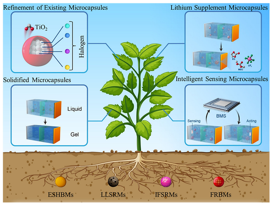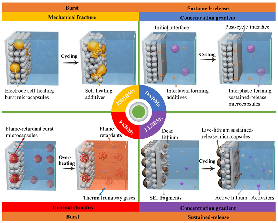 图1.电极自修复突释微胶囊(ESHBMs)、界面形成缓释微胶囊(IFSRMs)、阻燃突释微胶囊和活性锂缓释微胶囊在LIB中的应用。