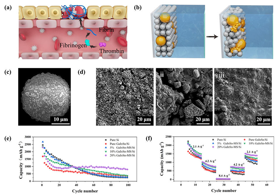 图3.电极自修复突释微胶囊。(a)仿生灵感。(b)机制。(c)微胶囊的SEM表征。(d)含微胶囊电极作用过程的SEM表征。(e)电流密度为2.1 A/g时的电池循环容量。(f)电流密度为2.1、4.2和8.4 A/g时的电池倍率性能。