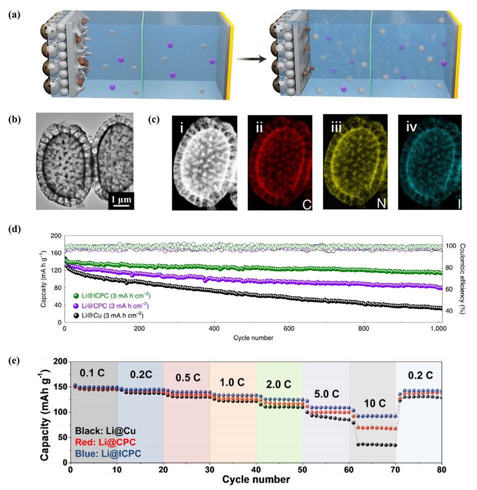 图5.活性锂缓释微胶囊。(a)机制。(b)微胶囊的TEM表征和(c)元素图谱。(d)使用Li@Cu和Li@ICPC电极的电池在0.2C下的循环性能。(e)使用Li@ICPC、Li@CPC和Li@Cu正极的电池的倍率性能(3 mAh cm-2)。