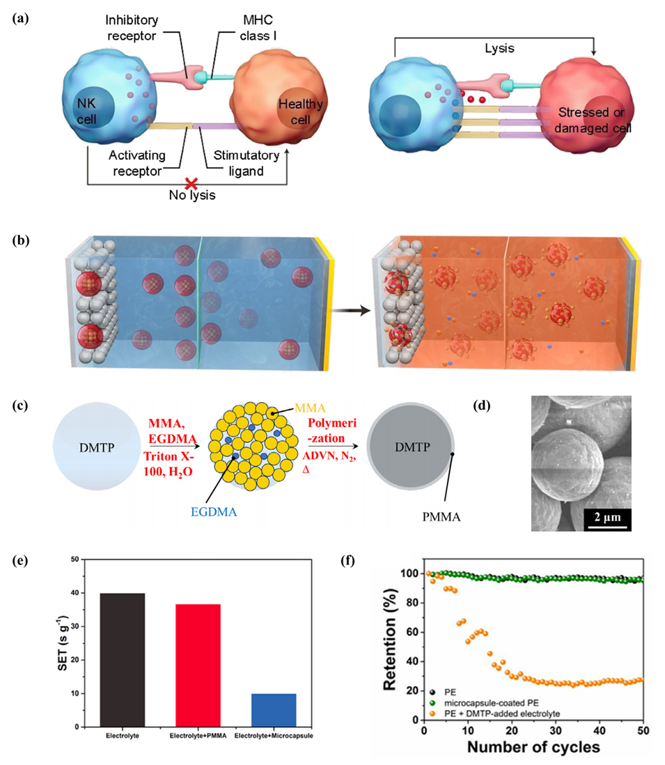 图6.阻燃突释微胶囊。(a)仿生灵感。(b)机制。(c)DMTP@PMMA的制备过程。(d)DMTP@PMMA的SEM表征。(e)DMTP@PMMA的阻燃试验。(f)电池的循环容量保持。(g)热失控过程中NCM523电池的温度曲线。(h)基于PE和N-H-microcapsule@PE隔膜的NCM523电池的循环稳定性。