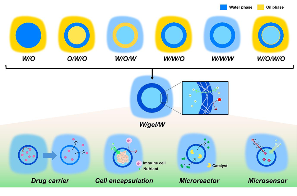 近期,有研究人员发表综述,系统总结了利用微流控乳液模板(包括单乳液、双乳液和三重乳液)制备水凝胶壳微胶囊的不同策略,并详细探讨了这类微胶囊在药物递送、细胞封装、微反应器和微传感器等领域的应用进展与挑战。相关研究成果以“Microfluidic production of hydrogel-shelled microcapsules and their applications”为题目,发表在期刊《Current Opinion in Colloid & Interface Science》上。
