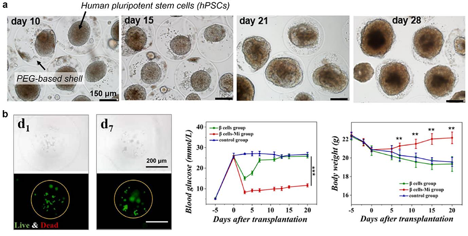 图5.(a)PEG外壳封装人多能干细胞(hPSC)球体向胰腺β细胞分化的过程(光镜图,培养10-28天)。(b)多孔微囊封装β细胞移植后1天(d1)和 7天(d7)的光学和共聚焦显微镜图像,以及三组(β细胞组、β细胞微囊组和对照组)的血糖曲线。