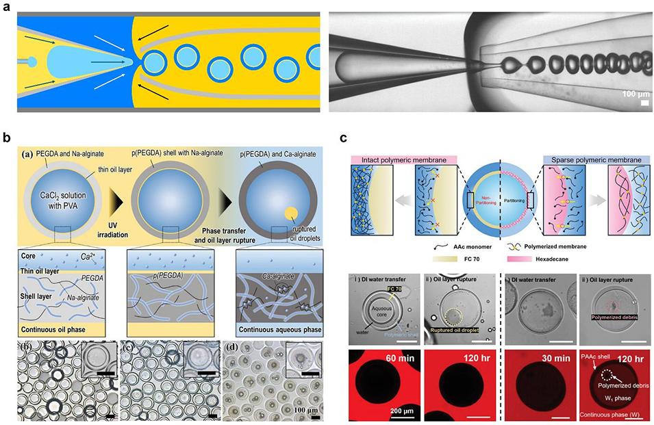 水凝胶壳能够实现水相内核的精确区室化,同时根据尺寸和电荷选择性调节跨膜分子转运。液滴微流控技术使单分散多重乳液液滴的生产成为可能,这些液滴是制备水凝胶壳的理想模板。