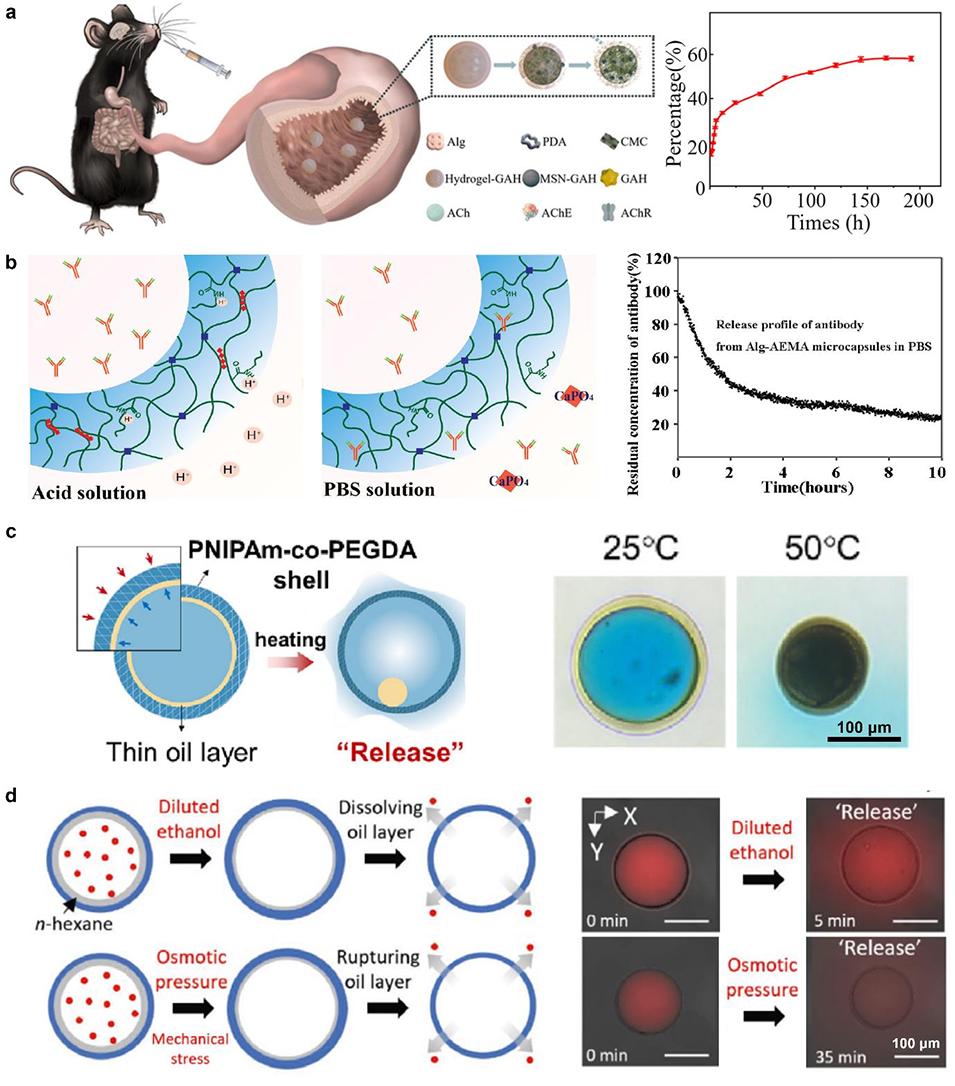 图4.(a)治疗阿尔茨海默病的多级键合水凝胶微胶囊结构及药物缓释曲线。(b)抗体负载核壳微囊在不同pH条件(酸性和碱性)下的示意图,以及在高pH(PBS溶液)下的货物释放曲线。(c)温敏性PNIPAm-co-PEGDA微胶囊高温下释放亲水药物的示意图,以及不同温度下相应的光学显微镜图像。(d)含全氟碳油层的PEGDA微胶囊在乙醇/渗透压刺激下触发释放的示意图及相应的光学显微镜图像。