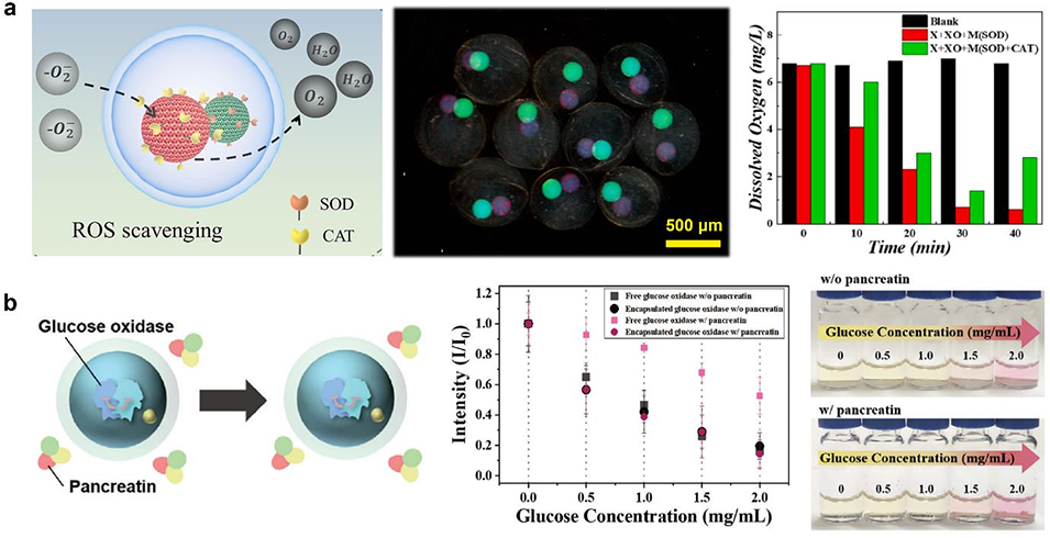 图6.(a)含SOD/CAT酶的逆蛋白石水凝胶(IOHP)微胶囊清除ROS的机制及荧光验证。(b)DN水凝胶外壳(聚丙烯酰胺/海藻酸)保护葡萄糖氧化酶(GOx),通过壳内荧光强度检测葡萄糖浓度。