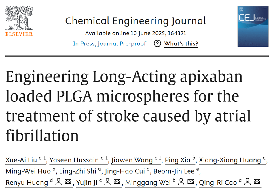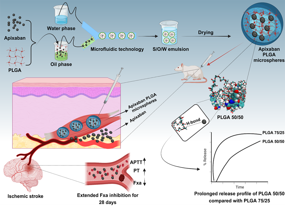 近期,苏州大学药学院曹青日教授团队联合苏大附一院中医科魏明刚教授等人开发了一种负载阿哌沙班的PLGA长效微球,通过微流控技术结合S/O/W双乳液-溶剂蒸发法制备,优化后微球表面光滑,粒径在45.99±0.07μm至71.74±0.02μm之间,封装效率超90%。分子模拟表明阿哌沙班与PLGA 50/50通过氢键作用实现长效释放,体内外实验显示其可延长抗凝血活性,FXa抑制作用持续28天,且具有良好的生物相容性,为房颤相关卒中预防提供了新的给药系统。相关研究以“Engineering Long-Acting apixaban loaded PLGA microspheres for the treatment of stroke caused by atrial fibrillation”为题目,发表在期刊《Chemical Engineering Journal》上。