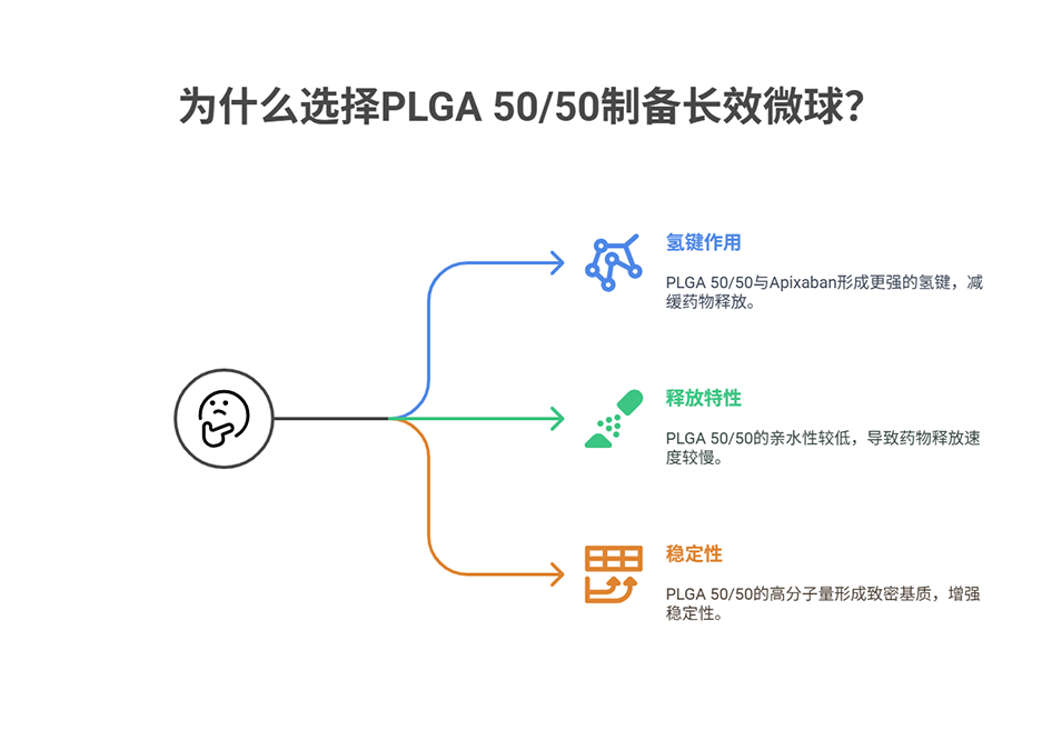 2、通过分子模拟证实,阿哌沙班与PLGA 50/50之间形成的强氢键(576个)使其释放特性从速释转变为长效释放,此机制有别于传统认知中PLGA 50/50比75/25释放更快的情况。