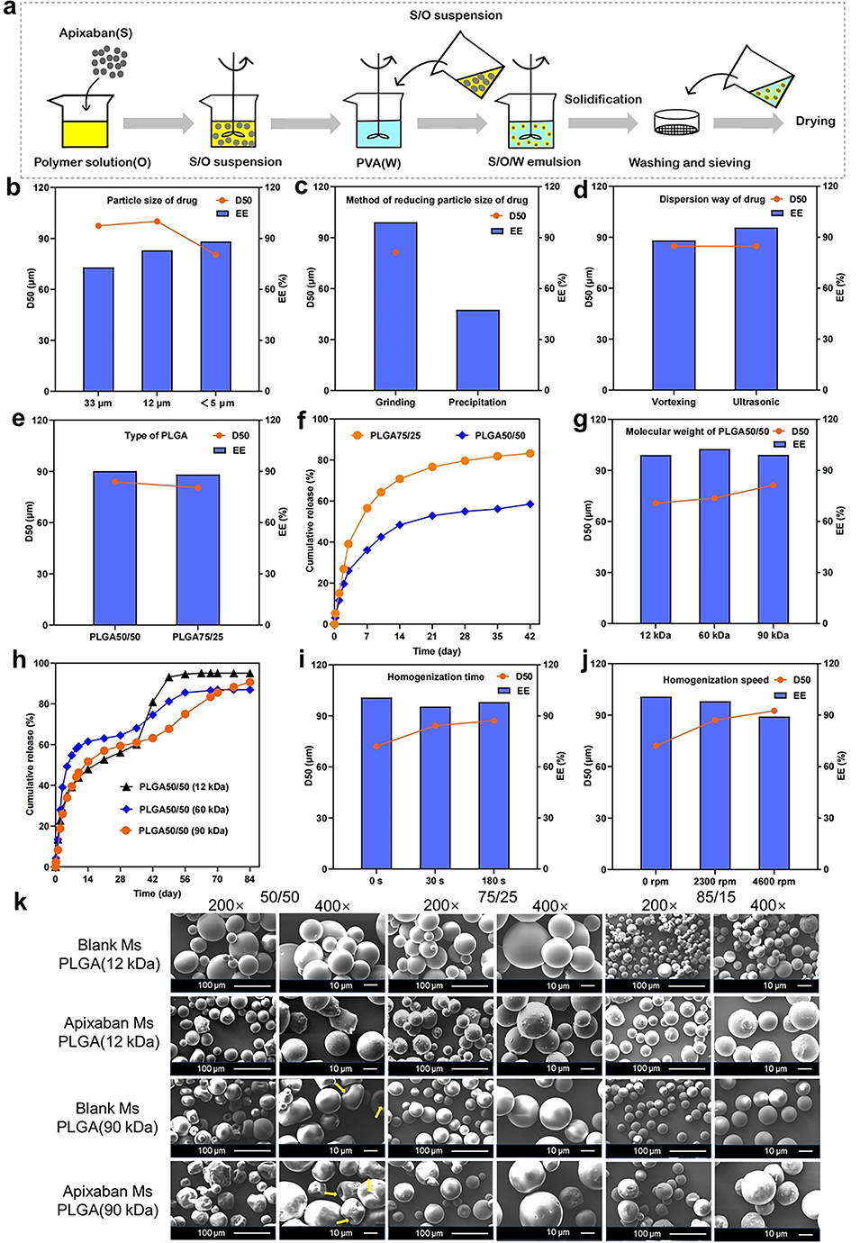 图1. (a)利用双乳液-溶剂蒸发法制备Apixaban微球的示意图。(b) Apixaban微球的包封效率与药物原料粒径的关系。(c)比较了通过研磨和沉淀两种方法获得的药物粒径对微球包封效率的影响。(d)比较了超声处理和机械搅拌两种方法对微球包封效率和粒径的影响。(e-f)不同PLGA类型(如PLGA 50/50和PLGA 75/25)对微球包封效率和粒径的影响。(g-h) PLGA 50/50不同分子量对微球包封效率和粒径的影响。(i-j)分别展示了双乳化均质时间和均质速度对微球包封效率和粒径的影响。(k)展示了不同PLGA类型(PLGA 50/50和PLGA 75/25)以及不同分子量的PLGA 50/50制备的微球的形态对比。