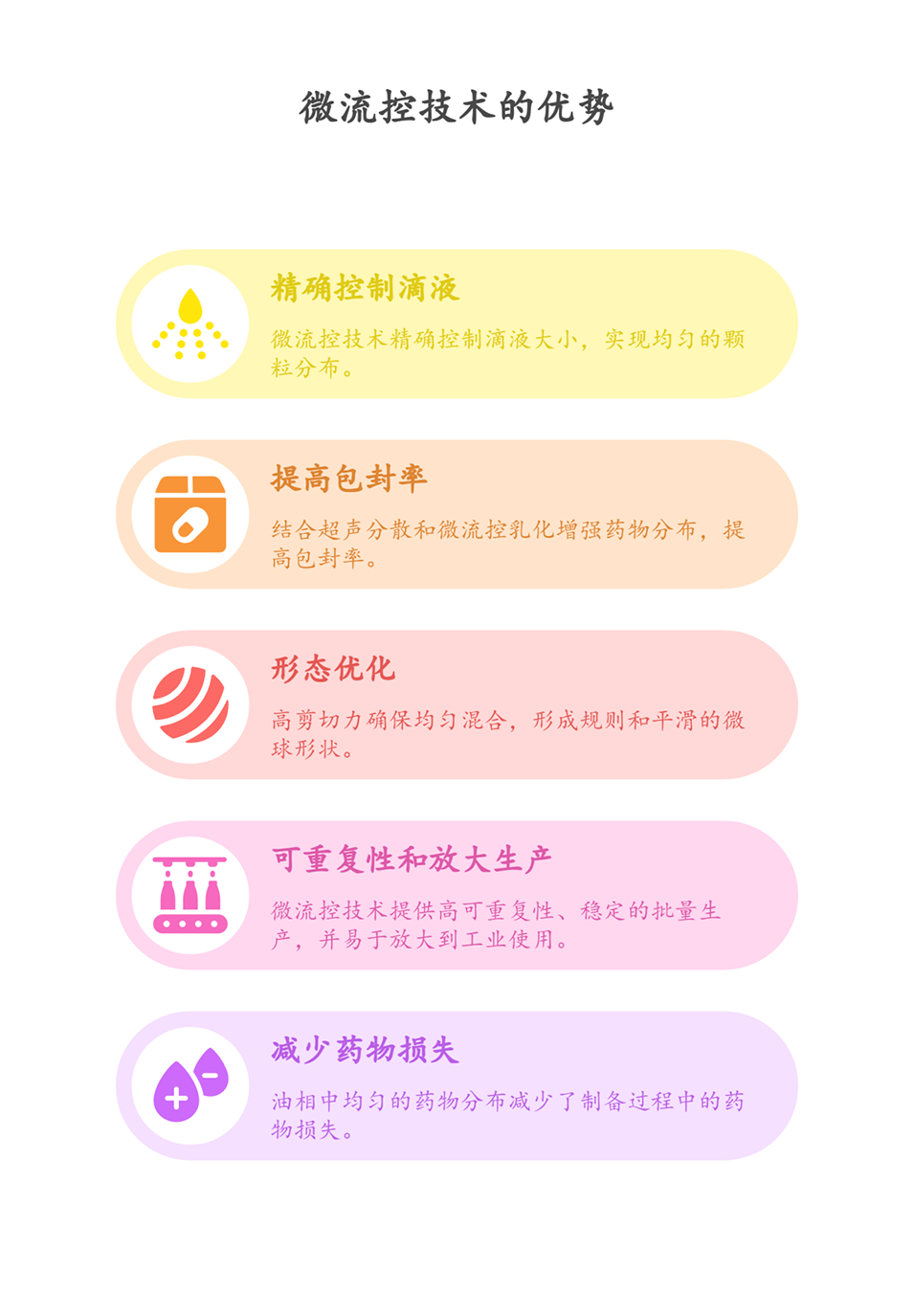 4、微流控技术在制备中展现出显著优势,其精确控制流速产生的高剪切力能优化微球形态,将粒径缩小至40-70μm,减少注射不适与针头堵塞风险,提升药物递送可行性。