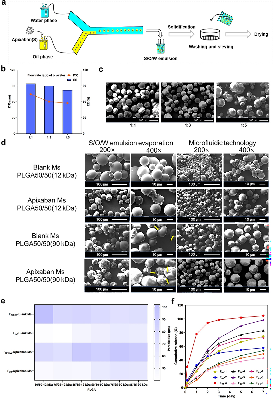 图2. (a)利用微流控技术制备Apixaban微球的示意图。(b-e)微流控技术制备的微球与传统方法制备的微球在形态和粒径上的对比。(f)正交设计组中Foe-6释放最慢(高分子量PLGA 50/50),Foe-3突释最高(低分子量PLGA)。