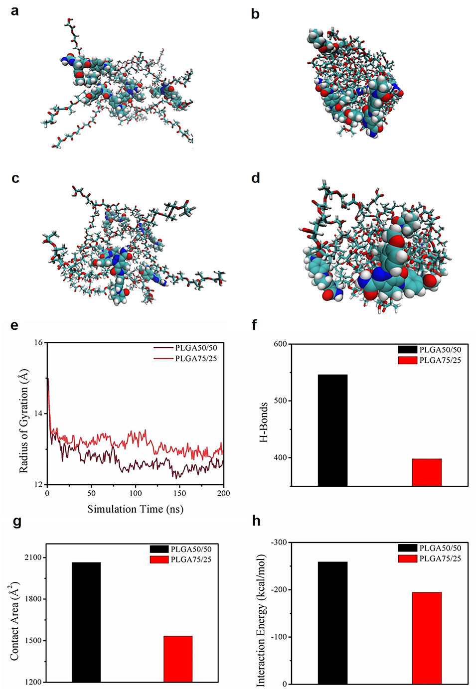 图3. (a-d)分子动力学模拟显示PLGA链从伸展态卷曲成团,药物向表面迁移。(e) PLGA 75/25回转半径(Rg)始终大于50/50(卷曲度更低)。(f) PLGA 50/50氢键数量(576)显著高于75/25。(g-h) PLGA 50/50与药物接触面积/结合力更强(解释缓释机制)。