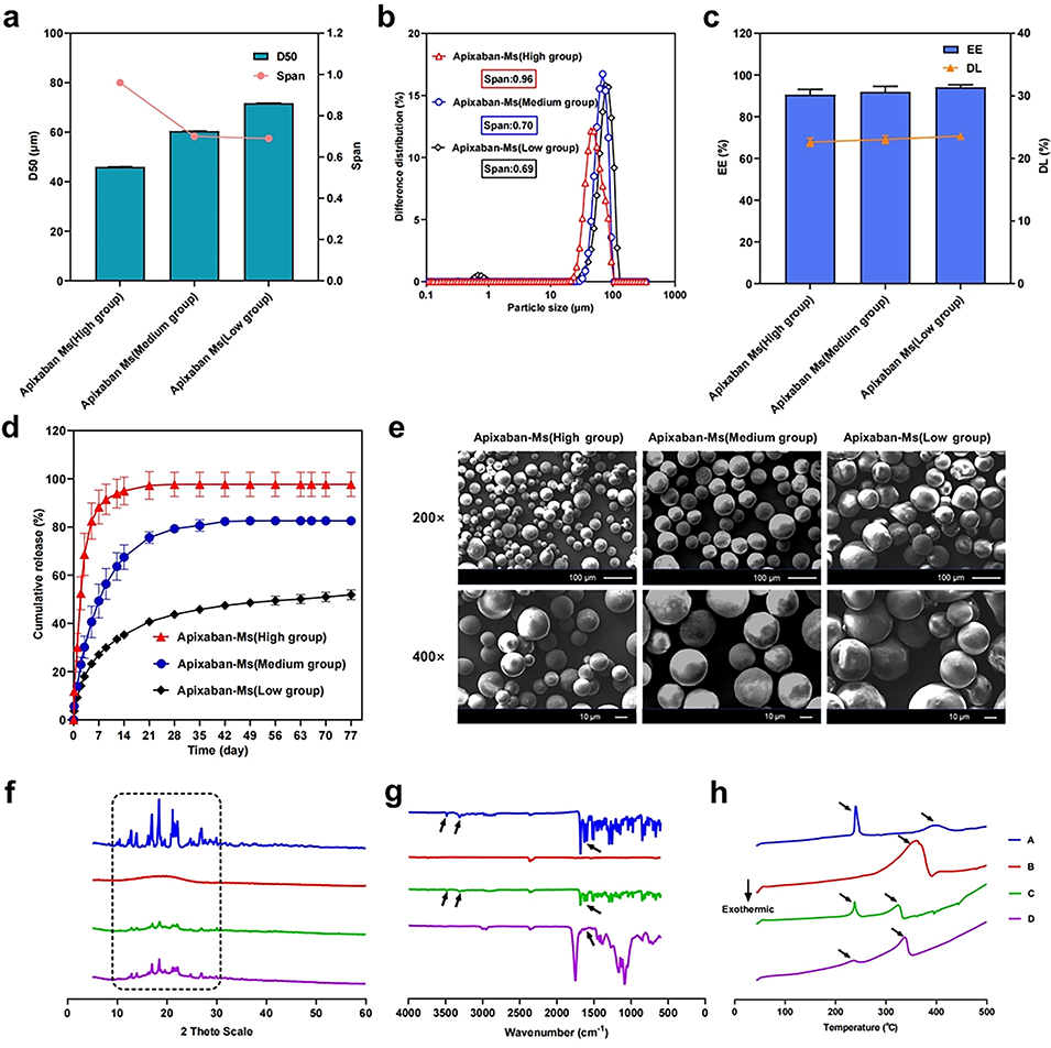 图4. (a-e)三种不同释放速率的Apixaban微球(低、中、高)的粒径、包封效率、药物载荷量和形态。(f-h)分别通过XRD、FTIR和DSC分析了Apixaban微球的晶体状态和药物-载体相互作用。
