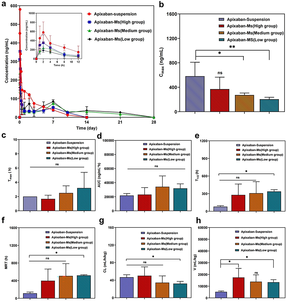 图6. Apixaban微球在体内的药代动力学特性。与Apixaban悬浮液相比,微球制剂在体内具有更长的循环时间和更缓慢的药物释放特性。Apixaban-Ms(低)组的Cmax较低,清除率降低,半衰期(T1/2)和平均滞留时间(MRT)延长,表明药物在体内的暴露时间更长,作用时间更持久。