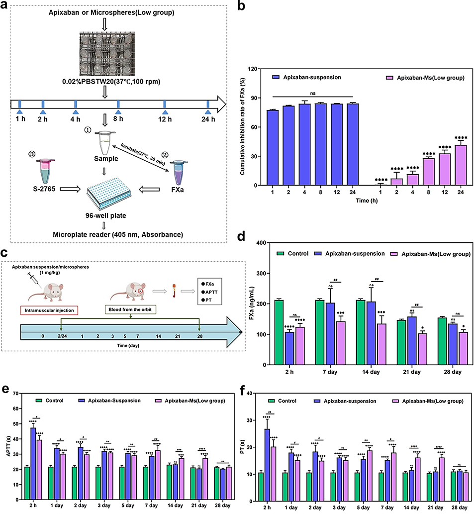 图7. (a-c) Apixaban微球的体外和体内药效学研究结果。(d-f) Apixaban微球在体内对FXa水平、APTT和PT的影响。
