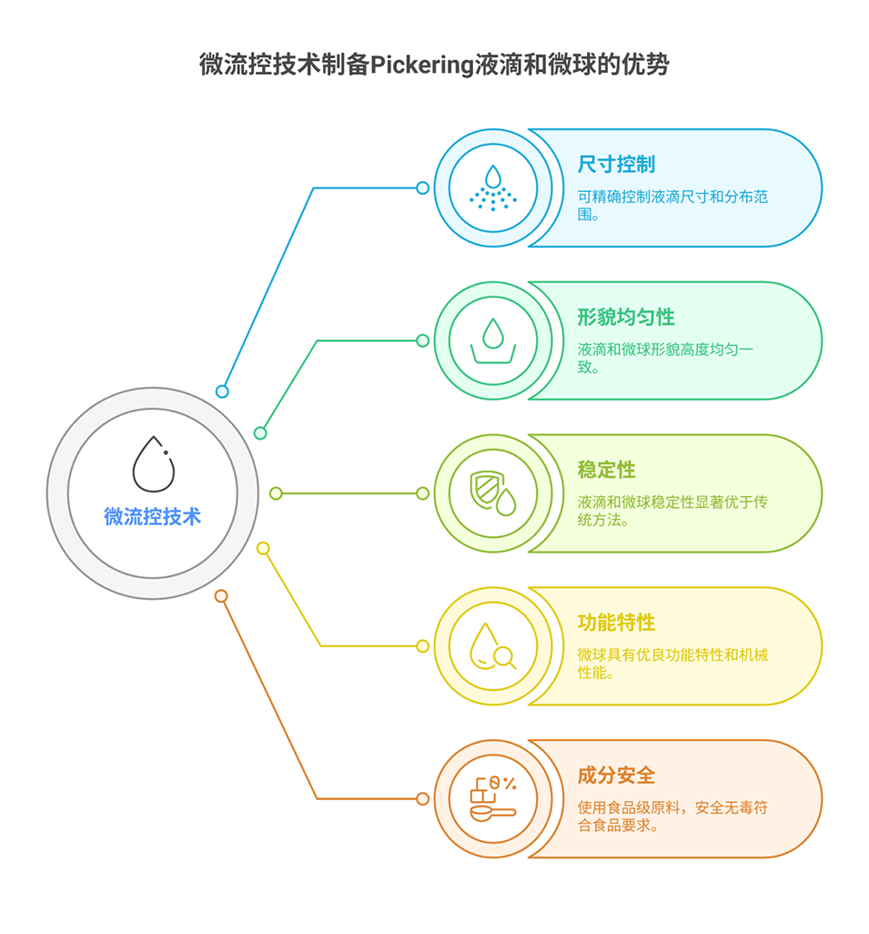1、本研究利用微流控技术制备了用于食品领域的Pickering滴液和微球,解决了传统方法导致的粒径分布宽、形态不均等问题。