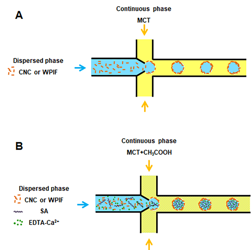 图1. 基于流动聚焦芯片形成Pickering液滴(A)和微球(B)的示意图。分散相(水相)和连续相(油相)分别用蓝色和黄色表示。